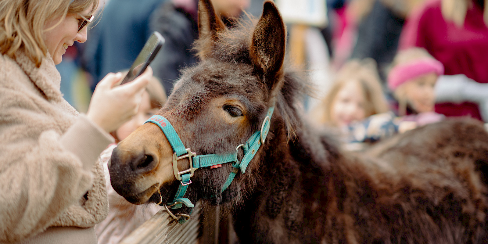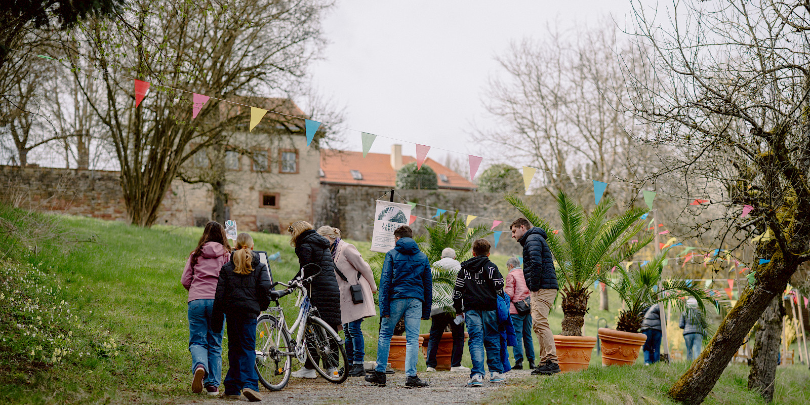 Die Besucherinnen und Besucher wurden am Fuße des Obstgartens vom Maulesel Jule empfangen und die Kinder bekamen ihr Stickerheft. Die erste Station erzählte vom Einzug Jesu nach Jerusalem: Mit einem „Drahtesel“ konnte man einen wunderschön geschmückten Weg entlangfahren.