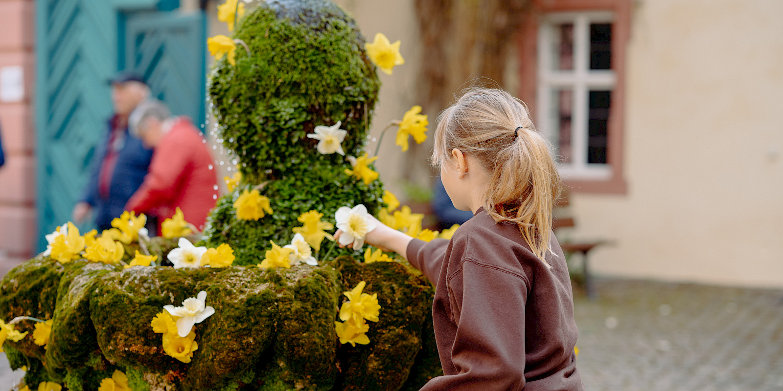 Beim Aufstieg aus der Kellerkapelle in den sonnengefluteten kleinen Innenhof konnte ich wiederum die Hoffnungskraft der Auferstehung im Licht spüren. Hier durfte jede Besucherin und jeder Besucher als Zeichen der Osterfreude eine Narzisse in den Brunnen stecken und die Kirche besuchen.